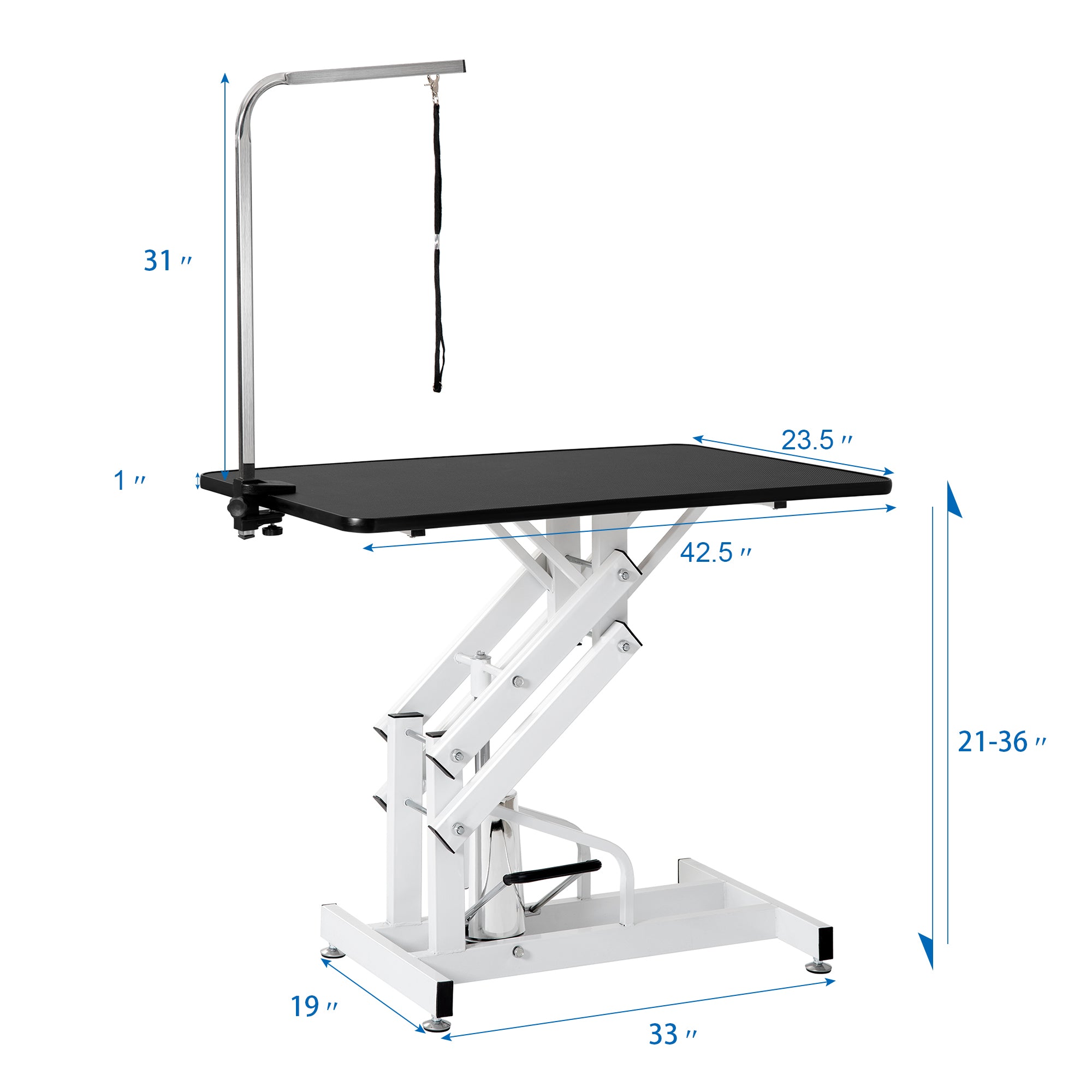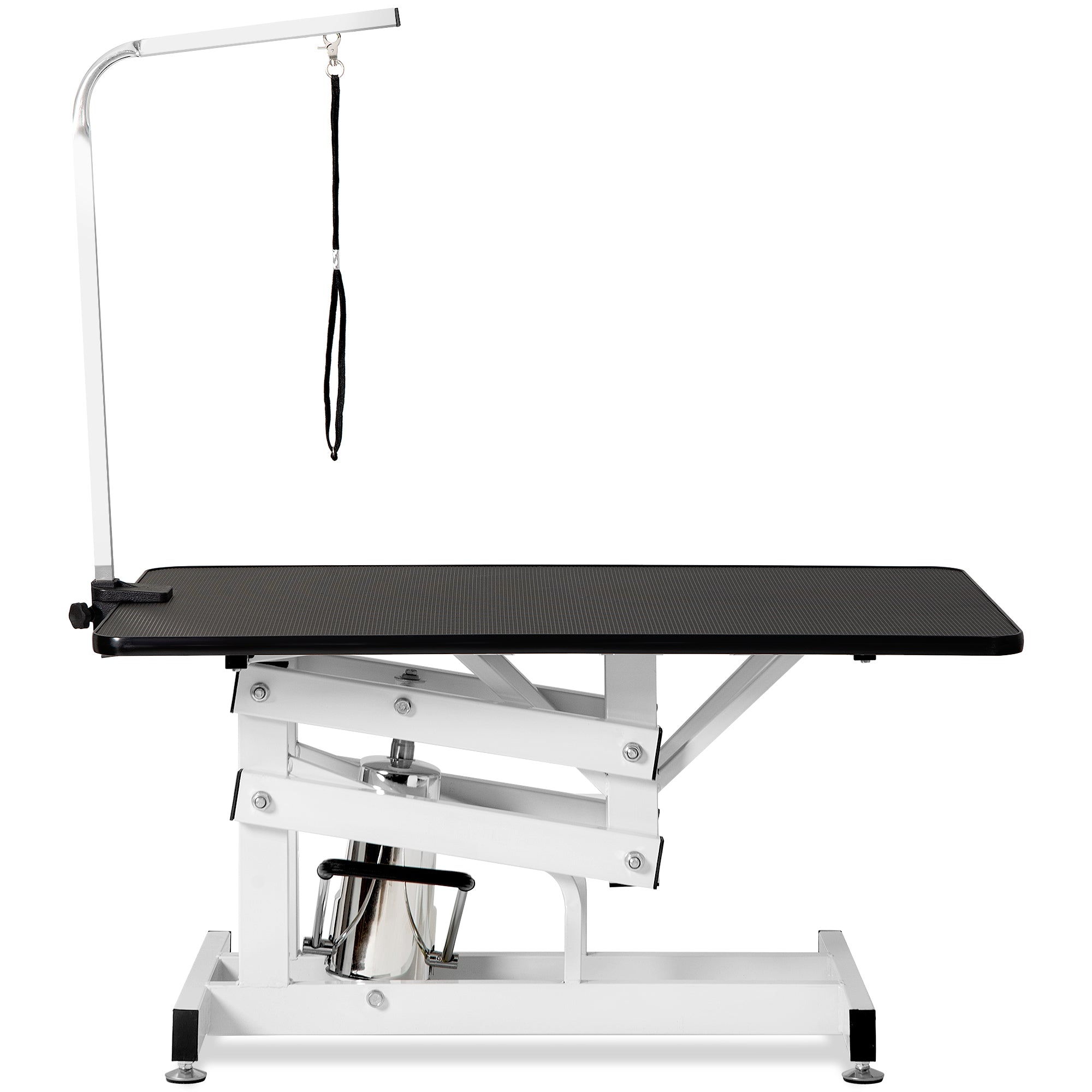 This professional grooming table is perfect for your pet dog or cat. With the hydraulic system, the table will raise the height of your pet so that you can reach him easily for bathing, trimming, drying, grooming or other pet care. The ribbed rubber surface of the table ensures your pets'safety. The rugged surface makes it easy to clean and remove hair and debris. The clamp-on adjustable grooming arm and security noose make it easier to groom your dogs and kitties. Made with a solid iron frame, the table is sturdy and durable for years.This table is designed for professional style grooming, but can fit in both a business and your home!